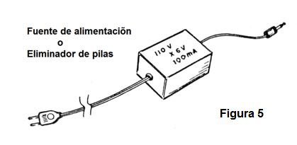 En la figura 5 tenemos un ejemplo de eliminador de pilas que debe tener exactamente la tensión que la radio necesita. Si su radio es de 2 pilas, el eliminador debe suministrar 3 V; Si utiliza 4 pilas debe suministrar 6 V y utilizar 6 pilas debe proporcionar 9 V.