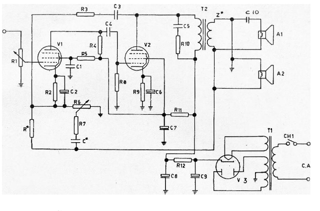 TI: Transformador de alimentación. Primario 220 voltios; secundario alta tensión 285 voltios, 80 mA; secunda-rio calefacción 6,3 voltios 3 ampéres.