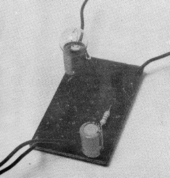 d) La conexión de la lámpara se puede hacer soldando directamente los cables en su zócalo, en cuyo caso será necesario dar una ligera limadura o lijada en el lugar para que la soldadura "tome", o bien con ayuda de zócalo. Un pedazo de hilo flexible doble hará la conexión de la lámpara a la placa.