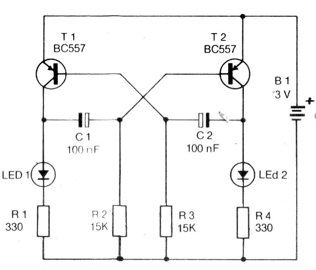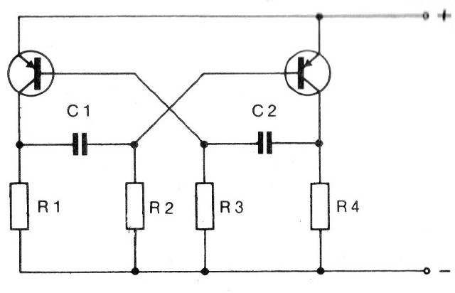 En este circuito los dos transistores se conectan a la desconexión alternadamente a una velocidad que depende tanto de los capacitores C1 y C2 como de los resistores R1 y R2.