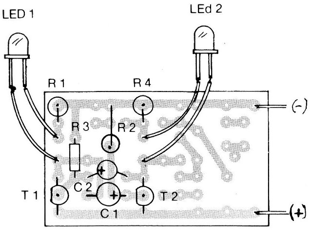 Los lectores que quieran pueden aumentar la velocidad de los intermitentes con la reducción de C1 y C2 a 22 o 47 uF o disminuir con el aumento de estos componentes a 220 o incluso 470 uF.