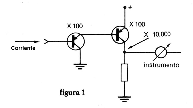 Tenemos entonces dos transistores que amplifican las pequeñas variaciones de corriente debidas a la variación de la resistencia de la piel, obteniéndose entonces una corriente mucho más intensa que puede accionar el instrumento. (figura 1)