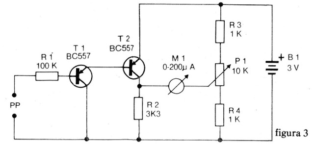 Los electrodos que pueden ser dos puntas de prueba o dos chapas de metal en las que la persona apoya las manos se conectan a la base del primer transistor. El emisor de este primer transistor se conecta a la base del segundo obteniendo un paso. Darlington de gran amplificación.