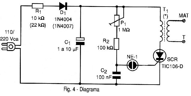 El circuito consiste en un oscilador de relajación que utiliza como componente principal un diodo controlado de silicio o SCR.