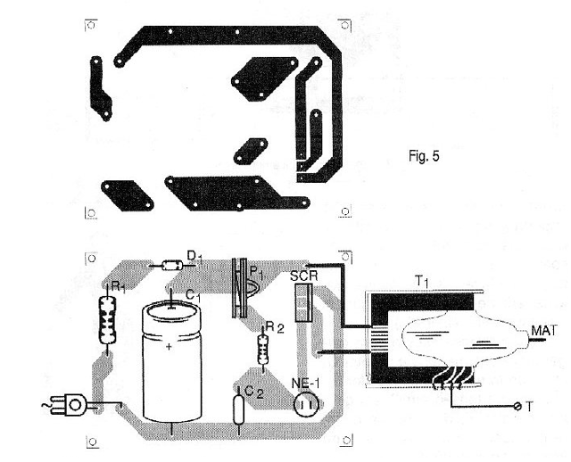 El resultado de esto es que disparado, el SCR cierra otro circuito de descarga que es el formado por el capacitor C1 y el devanado primario del transformador T1.