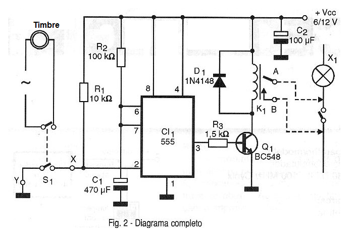 En la figura 2 tenemos el diagrama completo del sistema de accionamiento temporizado de la lámpara de entrada por el timbre.