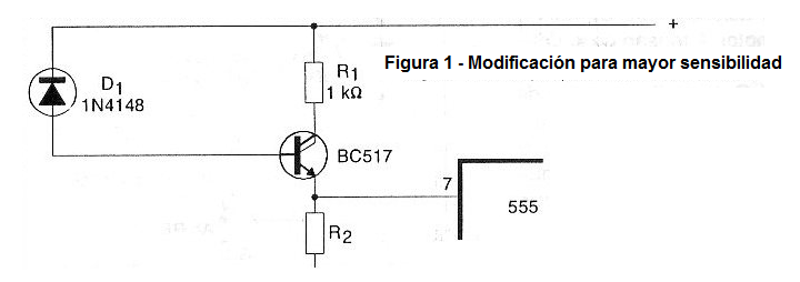 Para obtener mayor sensibilidad en este circuito podemos hacer que tengamos variaciones mayores de la resistencia entre el colector y el emisor del transistor con la corriente de fuga del diodo. Esto se puede lograr con el uso de un transistor de Darlington en lugar de un transistor común, como se muestra en la figura 1.