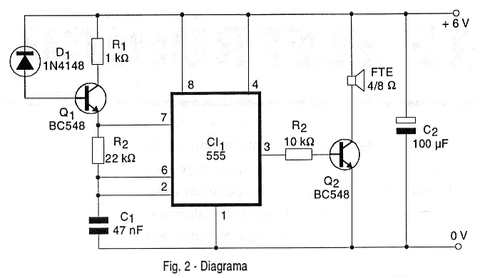 Un circuito integrado 555 se conecta como oscilador (astable) donde la frecuencia depende de C1, de R2 y también de la resistencia presentada entre el colector y el emisor del transistor Q1.