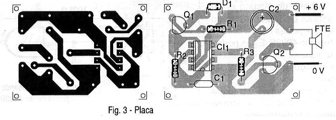 Los resistores son de 1/8 W o mayores y el capacitor C1 puede ser de poliéster como cerámico. El capacitor C2 es un electrolítico para una tensión de trabajo un poco mayor que la usada en la alimentación.