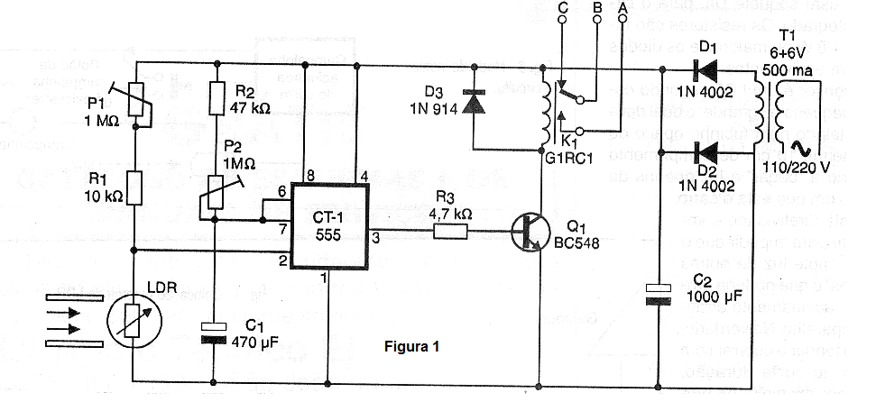 El circuito integrado 555 se conecta como monoestable donde el tiempo en que su salida permanece en el nivel alto depende del ajuste de P2 y del valor del capacitor C1. En realidad, C1 puede tener valores entre 10 uF y 1 000 uF dependiendo de la aplicación que el lector desea dar al aparato.