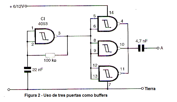 En el diseño original el mismo integrado se utiliza en el receptor y en el transmisor, pero si el transmisor tiene que permanecer lejos del receptor, podemos utilizar integrados separados y hacer aparatos separados. En este caso, los otros tres puertos del 4093 se pueden utilizar como búfer de amplificadores como se muestra en la figura 2.