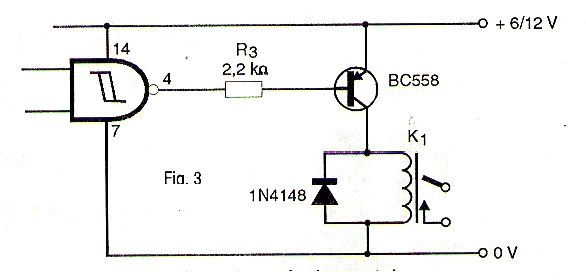 Con nivel alto en la entrada del inverso su salida se mantiene en el nivel bajo y con ello el transistor Q1 permanece cortado. El relé se mantiene desenergizado y carga conectada a sus contactos, que puede ser una sirena, desactivada.