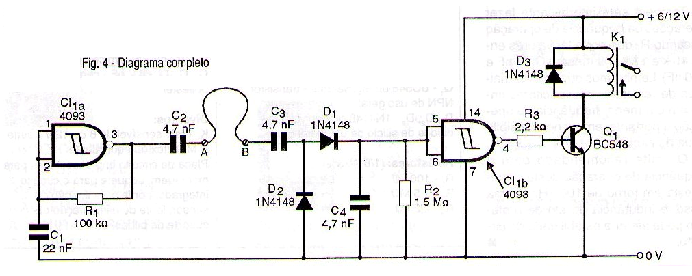 Esta señal se recibe vía C3 y se lleva a un sistema de detección que se basa en los diodos D1 y D2 y el capacitor C4 que hace su filtrado. Así, en la presencia de señal en el receptor, la entrada del inversor en que está conectado el detector tiene una tensión que es reconocida como nivel alto por el CI 4093.
