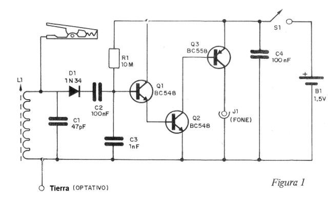 Después de la separación de la estación deseada en el circuito de sintonía (L1 / C1) la señal es detectada por un diodo (D1) y se lleva a los transistores que funcionan como amplificadores.