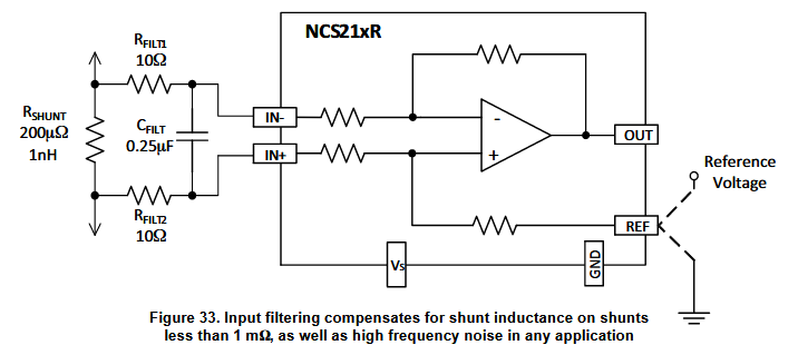 En el caso del monitoreo de una carga ruidosa, el datasheet muestra como adicional un filtro de compensación. El circuito de la figura 4 compensa la inductancia del shunt.