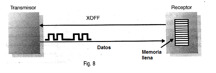 Cuando la memoria del receptor se acerca del punto de saturación, el receptor remite al transmisor una señal XOFF para que el deje de enviar las informaciones. Cuando la memoria se vacía, a medida que va utilizando las informaciones, y llega a un nivel que puede recibir más, una señal XON es enviado al transmisor. Con eso el receptor vuelve a la operación enviando un nuevo tren de informaciones, como se muestra en la figura 8.