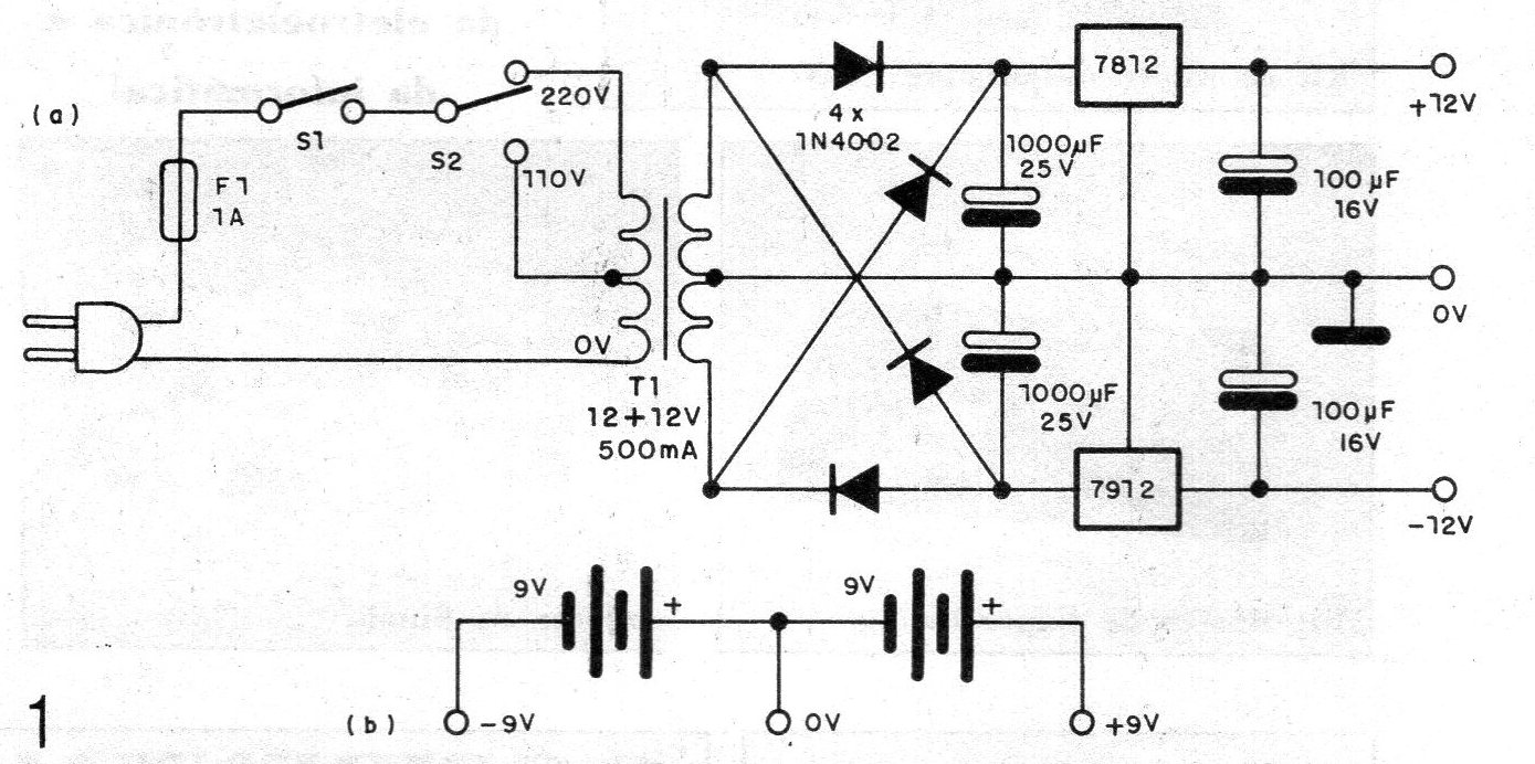 La alimentación del circuito se puede realizar con baterías comunes de 9 V como a través de una fuente fija, cuyo diagrama se da en la figura 1, que proporciona una salida de 12 V.