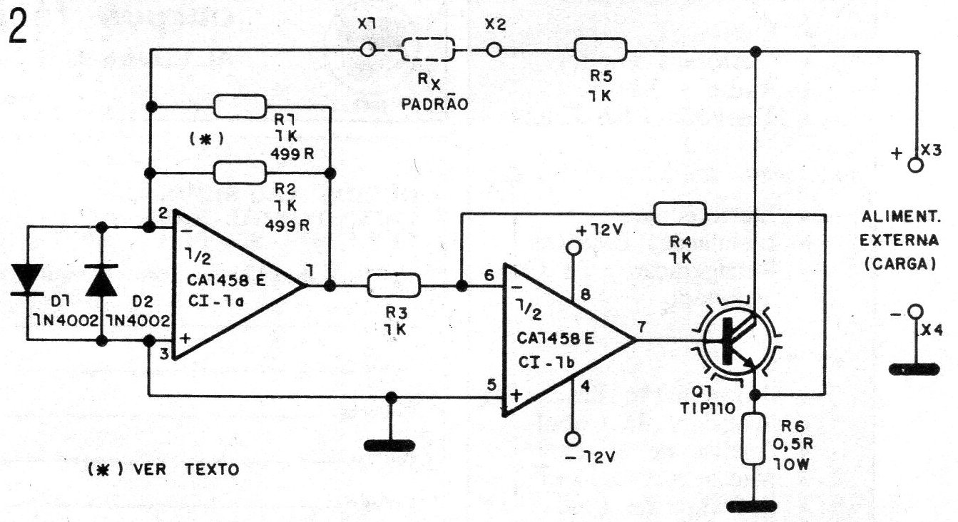 Utilizando el integrado CA1458E, que consiste en un doble-operativo (cada uno equivalente al conocido 741), y un transistor Darlington de potencia de 4 A, elaboramos una carga resistiva de gran utilidad para la prueba de fuentes de alimentación y otros circuitos que requieran resistores de bajos valores y altas disipaciones.