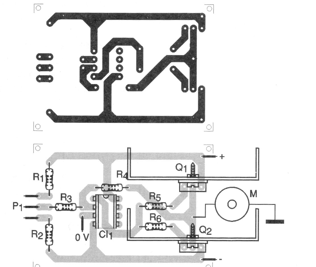 El circuito está especificado para motores de 12 V, pero motores de otras tensiones en el rango de 6 a 15 V pueden ser empleados.