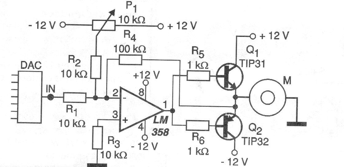En este circuito, las señales analógicas (tensión) obtenidas en la salida del convertidor D / A van a determinar la conducción de los transistores y con ello tanto la potencia aplicada al motor como su sentido de rotación.