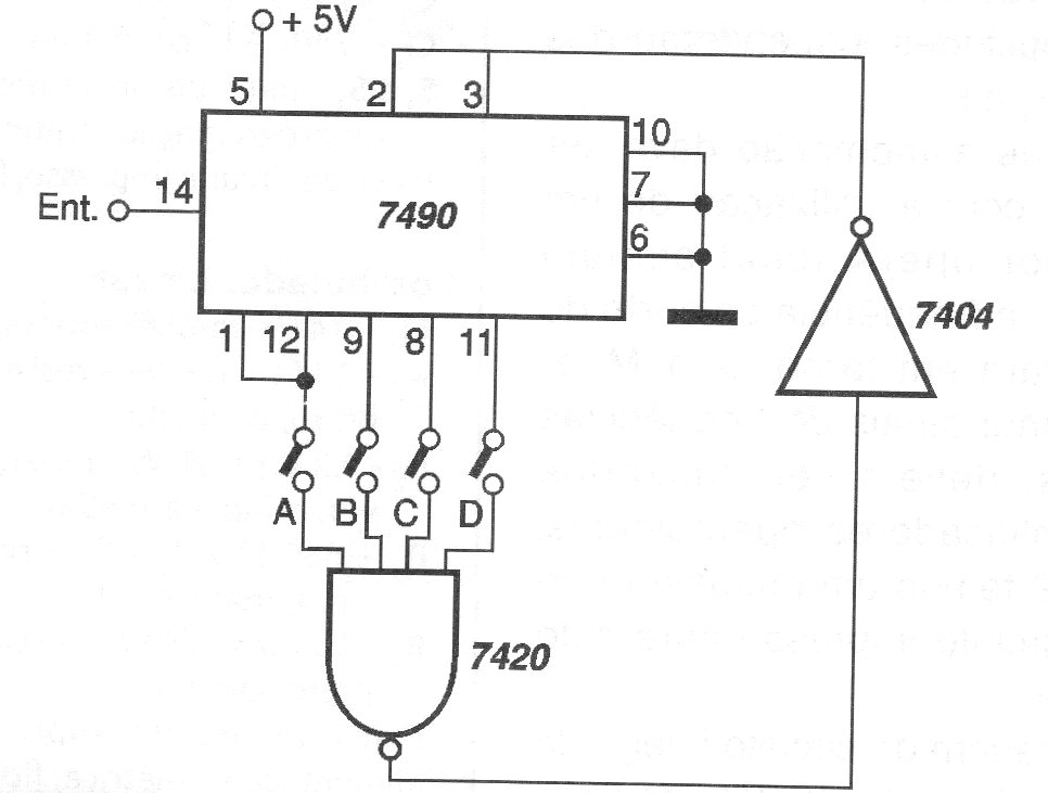 La misma idea, sin embargo, puede ser fácilmente transferida a circuitos equivalentes de tecnología CMOS, recordando que el 7490 es contador divisor por 10.