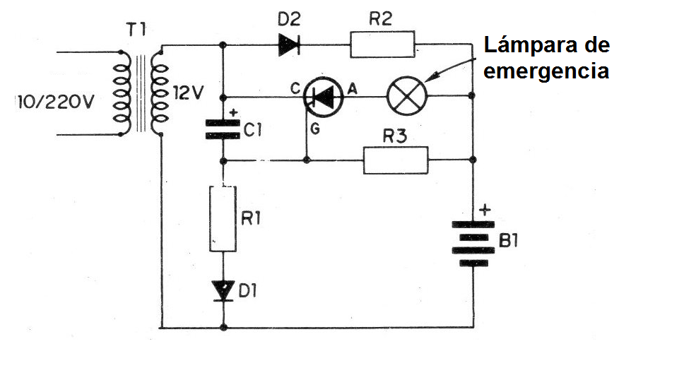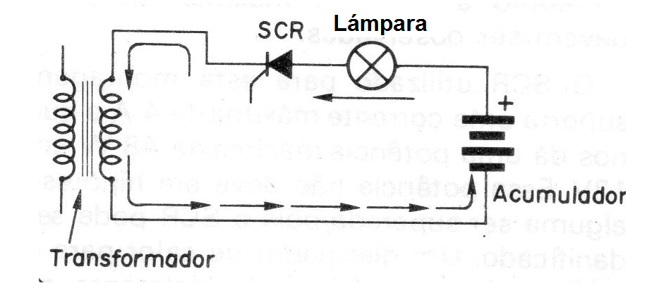 En el caso que describimos, por ejemplo, tenemos un circuito que, mientras haya suministro de energía, mantiene un acumulador (batería) de 12 volts cargado hasta el momento en que haya interrupción. En ese momento un SCR pasa de su estado de no-conducción para completa conducción habiendo el suministro de energía del acumulador a la (s) lámpara (s) de emergencia.
