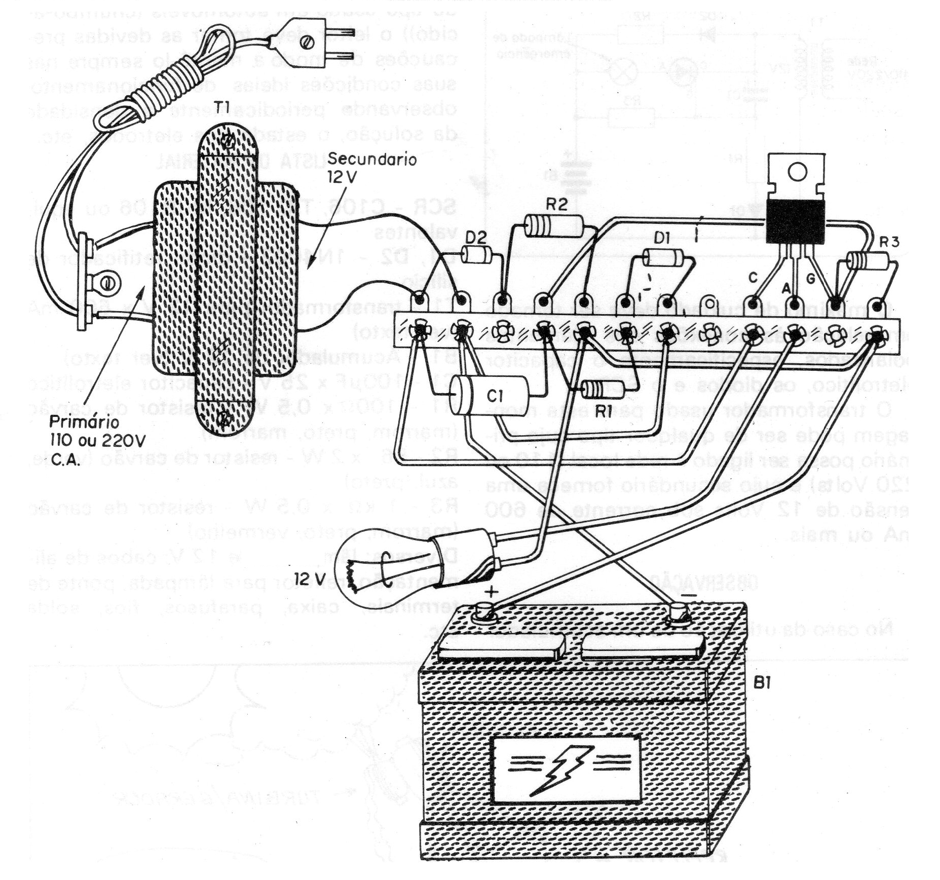 Los componentes para este circuito deben ser dimensionados para funcionar en armonía. Así, el SCR debe ser capaz de soportar la corriente requerida por el sistema de iluminación, mientras que el diodo rectificador debe ser capaz de soportar la corriente de carga del acumulador.