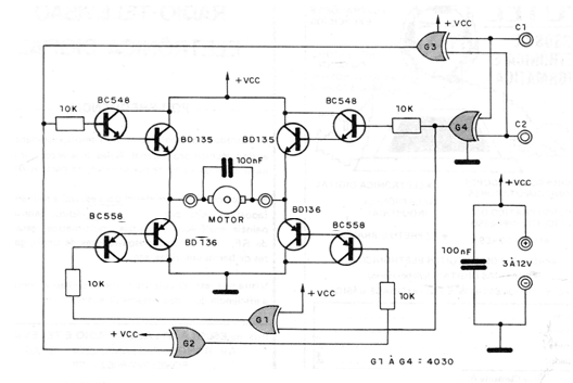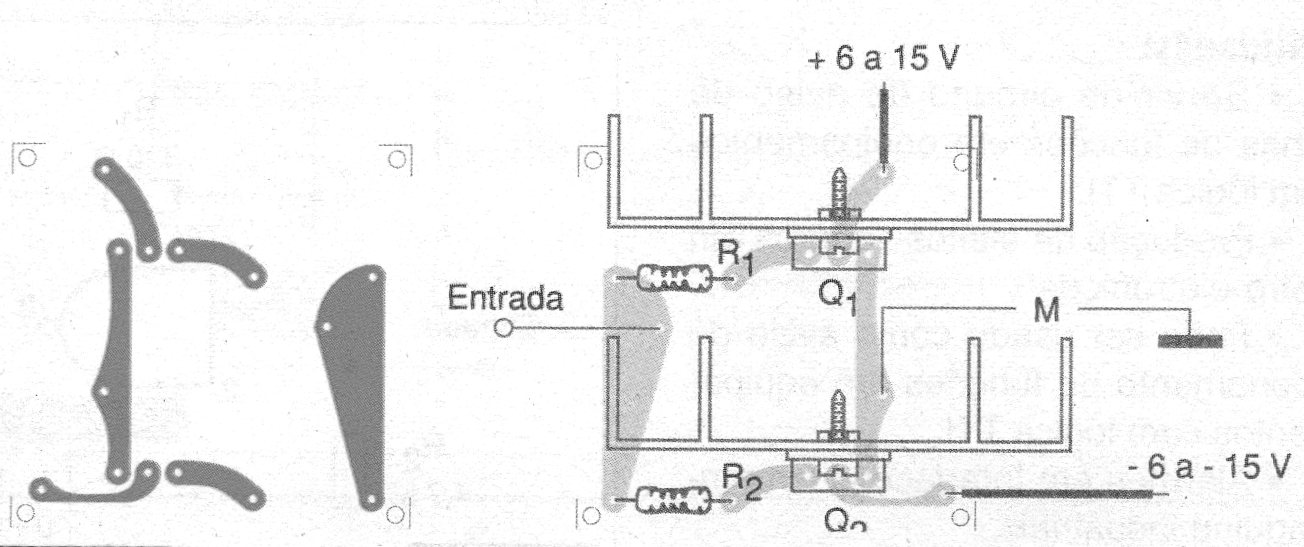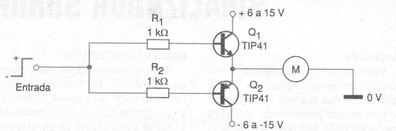 Observe que, dependiendo de la intensidad de la corriente requerida por el motor, los transistores deben estar dotados de radiadores de calor apropiados.