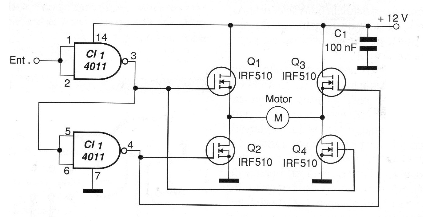 De esta forma, los transistores de efecto de campo de potencia que forman el puente H conducen dos a dos estableciendo sentidos diferentes de circulación de la corriente a través del motor. Con el nivel alto en la entrada el motor gira en un sentido y con el nivel bajo en la dirección opuesta.