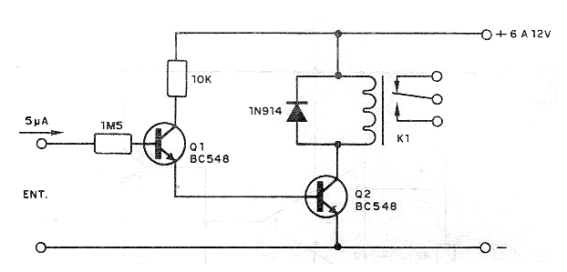 Con el circuito de la figura 11 es posible accionar relés de 20 mA a 100 mA de corriente de bobina con tensiones de 6 a 12 V, aplicando una corriente de entrada de sólo 5 uA.
