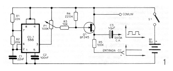 Este circuito convierte una tensión continua pura de muy bajo valor en una tensión pulsante de igual amplitud y frecuencia determinada por los elementos del oscilador. Entre las posibles aplicaciones para este circuito citamos la utilización de milivolts, de corriente alterna, en la medida de tensiones continuas de valores muy bajos.