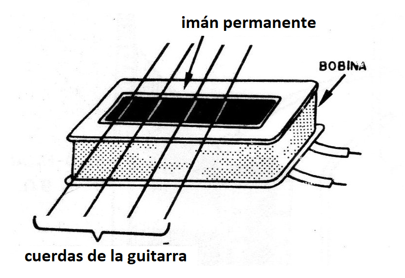 Esta bobina se coloca bajo las cuerdas de la guitarra. Al tocar las cuerdas vibran cortando las líneas de fuerza del campo magnético del imán permanente produciéndose entonces una perturbación magnética que induce en la bobina una corriente que presenta las mismas características del sonido producido por las cuerdas que están vibrando. Esta corriente llevada a un amplificador puede ser ampliada y aplicada a un altavoz con la reproducción del sonido original.