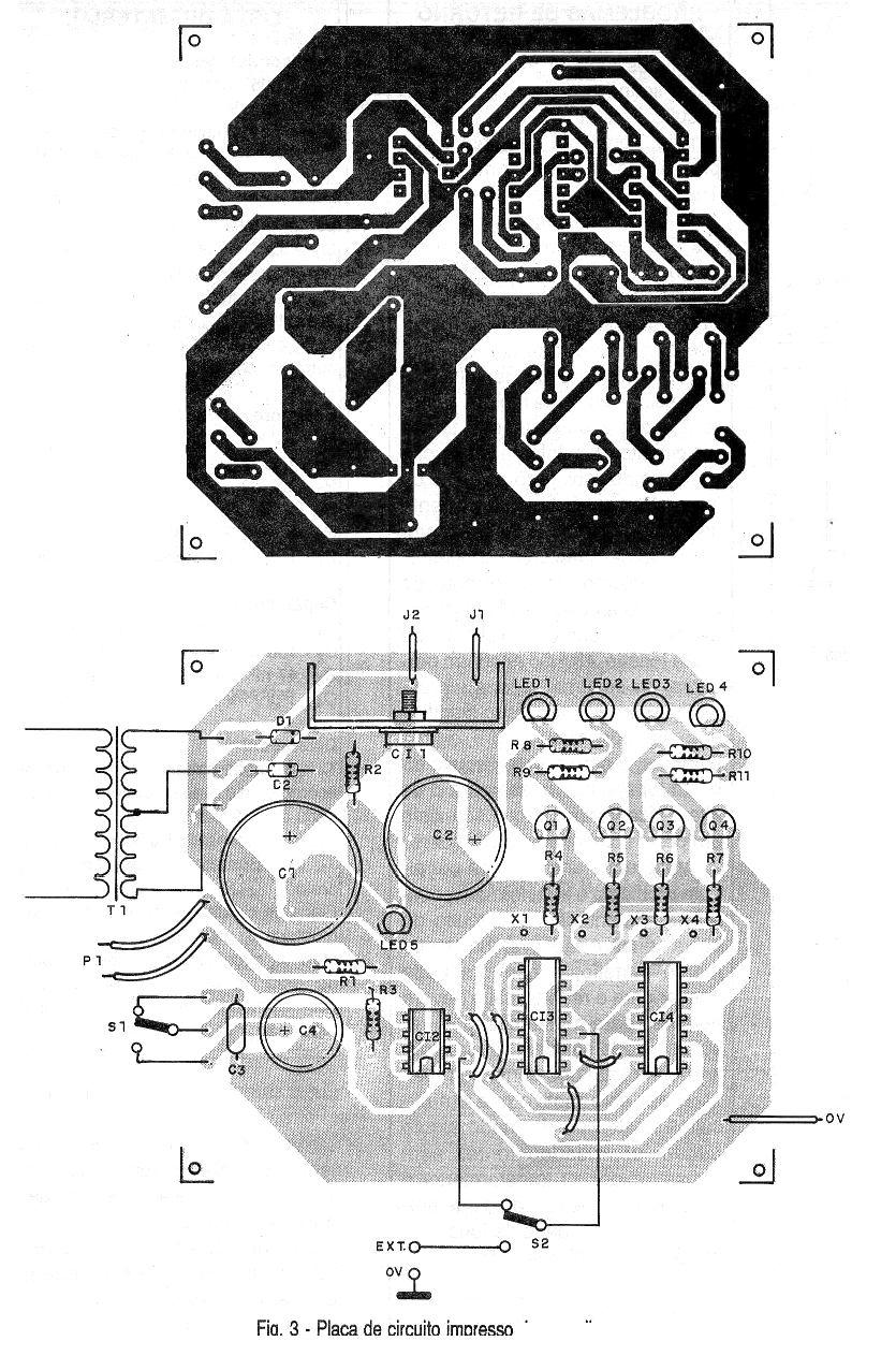 Se trata de un secuencial de 4 canales TTL, pero que tiene una salida flotante que puede ser usada para el accionamiento de diversos tipos de cargas y un reloj que puede operar una enorme banda de frecuencias: entre fracción de hertz y algunos cientos de kilohertz. Y si el usuario no desea utilizar el reloj interno, basta conmutar esta función por medio de una llave y pasar a emplear un reloj externo.