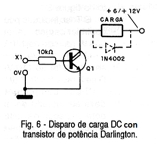 Para el disparo de cargas de corriente continua se puede utilizar el circuito de la figura 6 que tiene como base un transistor Darlington NPN de potencia. La corriente máxima de la carga dependerá del transistor utilizado.