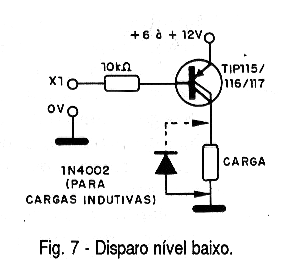 Ver que, utilizando un transistor NPN tenemos el accionamiento de la carga con la salida del secuenciador en el nivel alto. Podemos invertir este accionamiento con el empleo de un transistor PNP, pero debe ser conectado de la forma indicada en la figura 7.