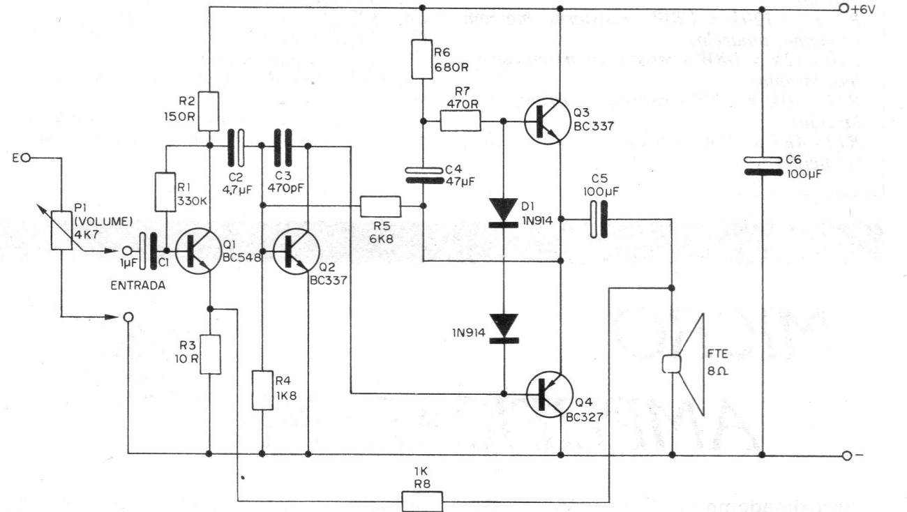 Si necesita un paso de salida para un receptor o un sintonizador, un paso de salida para auriculares, un amplificador para un intercomunicador, un miniamplificador de pilas para una sirena u otro efecto sonoro, éste es el recomendado. Utilizando transistores en salida complementaria, este circuito tiene excelente sensibilidad y calidad de sonido.