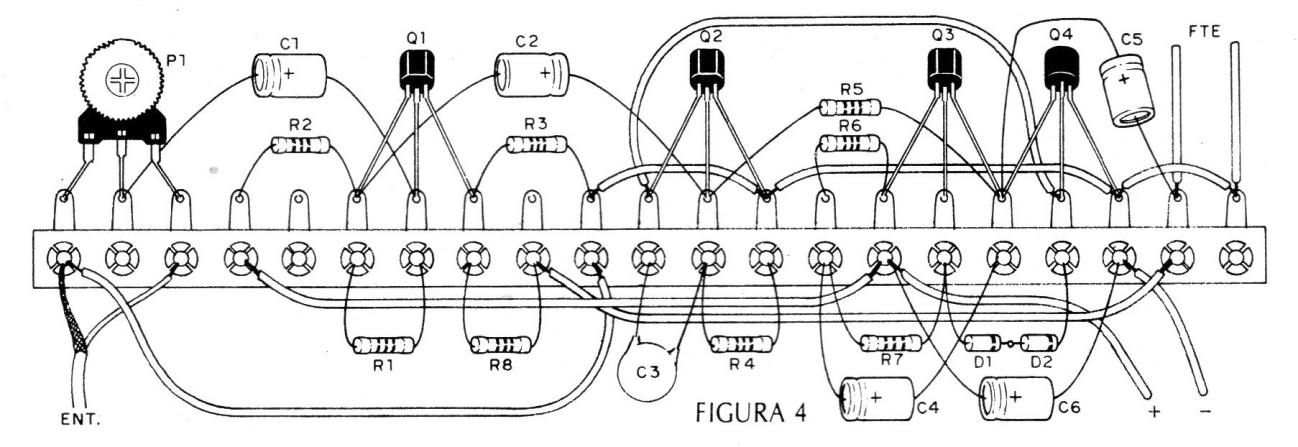 Se utilizan 4 transistores en tres etapas de amplificación, como sugiere la figura 1.