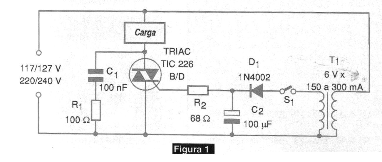 C1 y R1 forman un circuito "snubber" evitando la generación de armónicos y transientes en la línea, principalmente si la carga conmutada es inductiva. El transformador tiene primario de acuerdo con la red local y secundaria de 6 a 9 V con corriente entre 150 y 300 mA.
