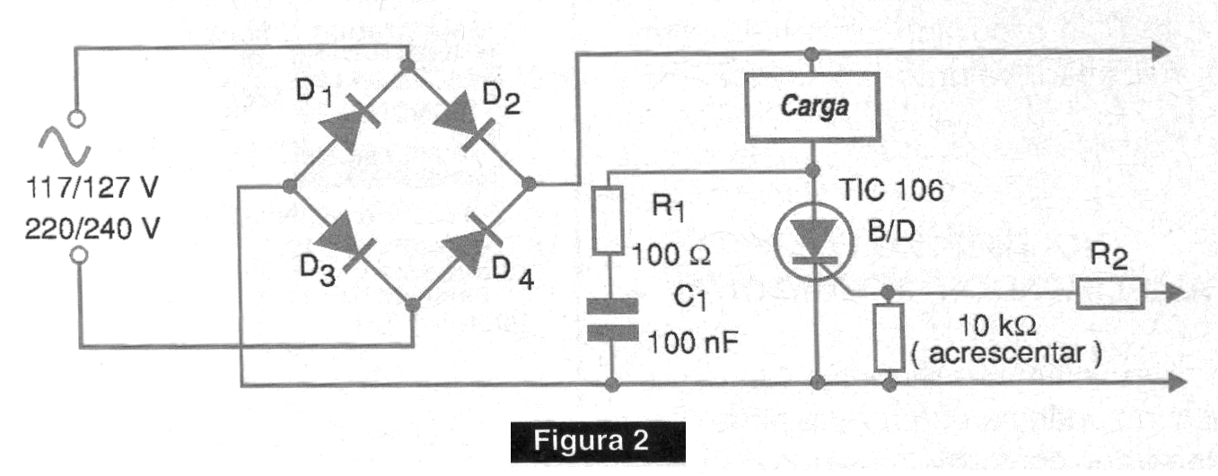 Observamos que la misma configuración puede ser usada con SCRs para el circuito tendrá un control de apenas media onda. Una posibilidad para el uso de SCR consiste en añadir un puente como muestra la figura 2.
