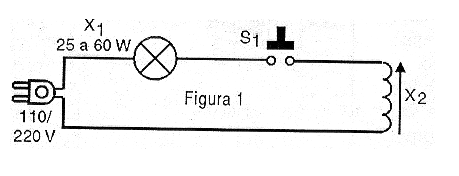 La lámpara incandescente con tensión de acuerdo con la red de energía puede tener potencias de 25 a 40 W. S1 es un botón de timbre. En la misma figura 2 tenemos el modo de hacer un pequeño cañón que disparará bolitas de isopor o frijoles a distancia cuando el tornillo sea tirado hacia el interior de la bobina. Si el lector desea, puede intentar aprovechar la bobina de un solenoide extraída de una lavadora fuera de uso o la bobina de un timbre u otro dispositivo en el que se pueda quitar el núcleo.