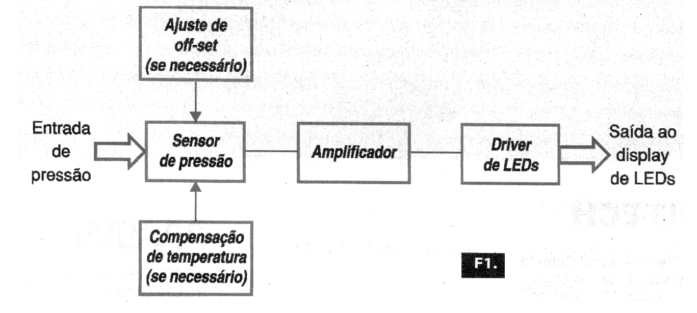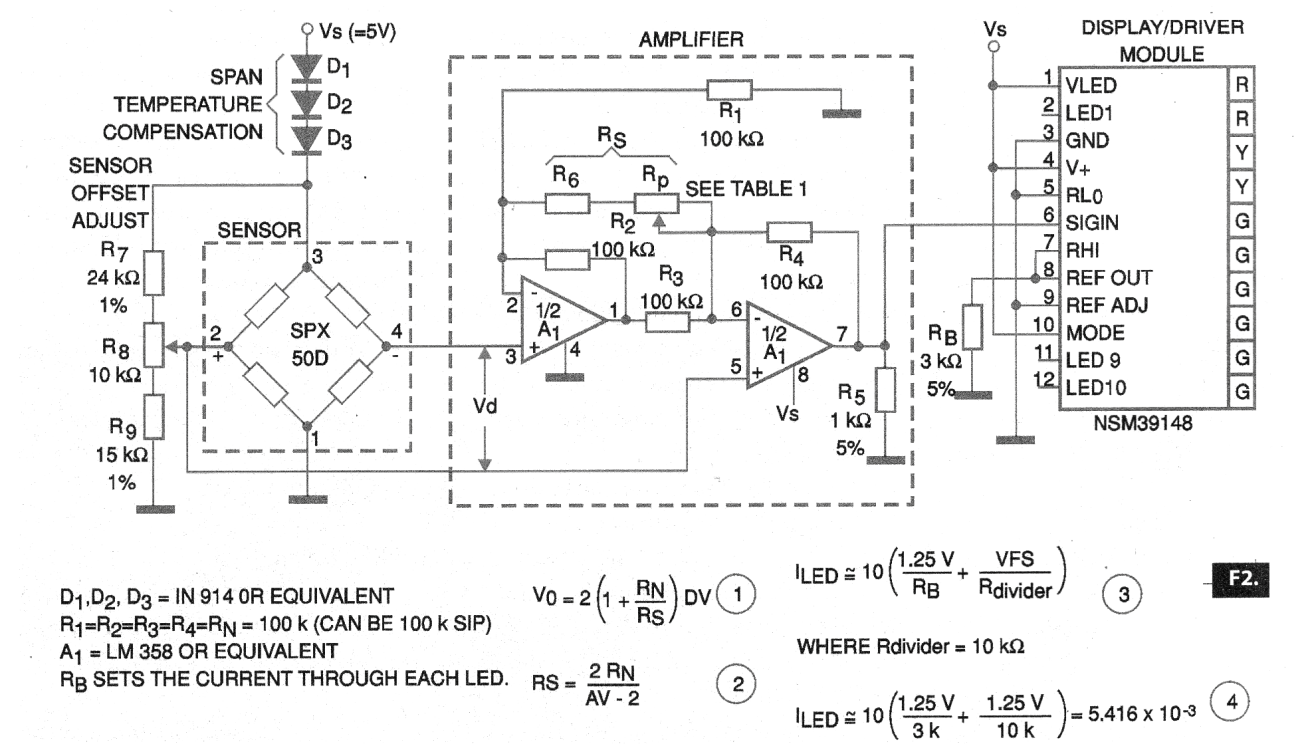 El circuito propuesto por Honeywell, y que presentamos en este artículo, utiliza una barra de 10 LED para indicar presiones en un rango de 0.0 a 0.5 psi, pero esta pista puede ser modificada sólo con el cambio del sensor.
