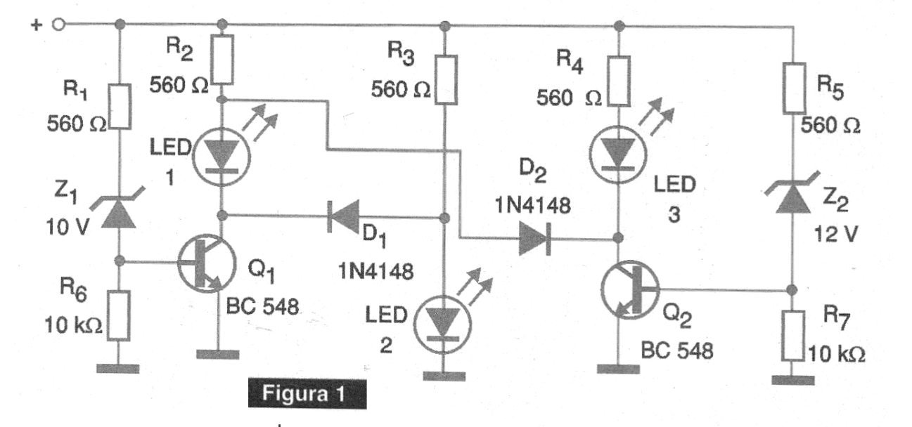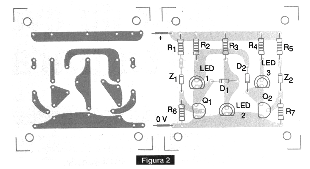 Por supuesto, dependiendo de la aplicación el lector puede fijar otras bandas de tensión cambiando el diodo zener. Como el consumo del circuito está prácticamente determinado por los LED, no tendremos un desgaste rápido de la batería causado por su presencia. Los LED, para mayor facilidad de indicación, deben ser de colores diferentes. En realidad, incluso se pueden utilizar LEDs tricolores, con las debidas modificaciones en el diseño de la placa de circuito impreso.