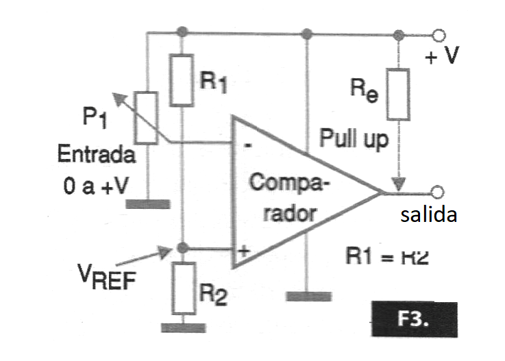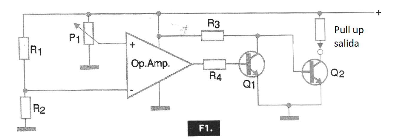 En la figura 1 tenemos la configuración básica de un comparador típico en el que además de un amplificador operacional tenemos una salida de potencia con un transistor en colector abierto.