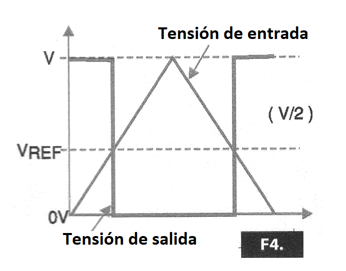 Cuando la tensión de entrada cae al pasar por el valor de referencia, se produce una nueva conmutación y la salida va al nivel máximo (+ V) de nuevo. La figura 4 muestra en un gráfico lo que ocurre.