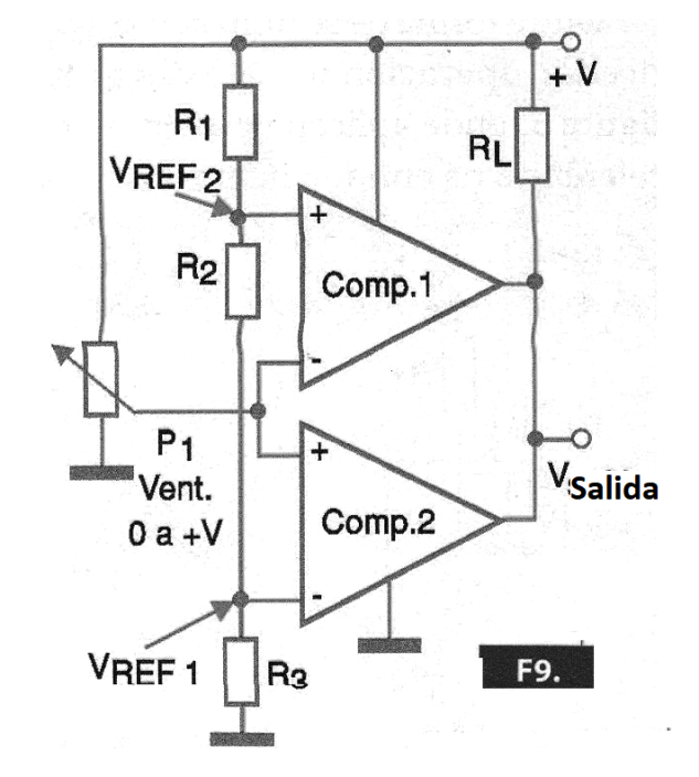 Este comparador proporciona una salida cuando la tensión de entrada se sitúa entre dos valores de referencia, programados por una red divisora. En la figura 10 tenemos un gráfico que muestra el comportamiento de ese circuito, en el que la tensión de salida de los dos comparadores estará en el nivel alto cuando la tensión de entrada esté entre los valores de referencia.
