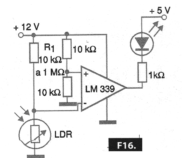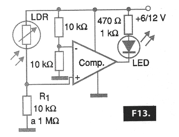 El primer circuito es de un sensor foto-eléctrico usando un LDR como elemento sensible. La sensibilidad de este circuito depende de R1 que puede tener valores entre 10 k y 1 M. La configuración que activa un LED en la salida se muestra en la figura 12 y puede ser alimentada con tensiones de 5 a 12 V.