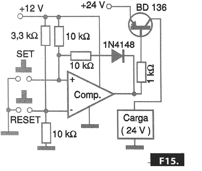 En la figura 15 tenemos otra aplicación para un comparador de tensión que está configurado para presentar histéresis. Se trata de un relé biestable o flip-flop que opera con dos tensiones.