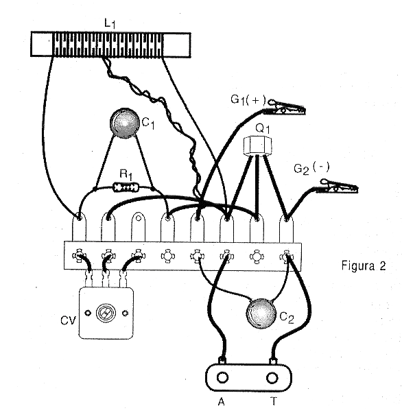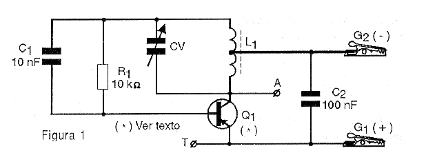 La bobina L1 está formada por 40 + 40 vueltas de alambre esmaltado 24 o más fino en un bastón de ferrita de hasta 20 cm de longitud y de cualquier diámetro. Los puntos A y T sirven para la conexión de una antena y la tierra con lo que se obtiene un pequeño aumento del alcance. La antena puede ser un pedazo de hilo común de 2 a 5 metros de largo estirado.