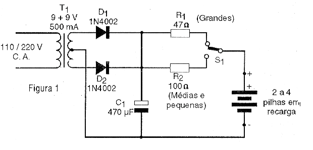 Así, en nuestro cargador tenemos en la entrada un transformador que baja la tensión de la red de energía a un valor seguro ya la vez aísla la red de modo que no haya peligros de choques en su manejo. La tensión alternada obtenida en el transformador es entonces rectificada por diodos y después de filtrada aplicada a una resistencia en serie con las pilas que deben reactivarse. El resistor es el limitador de corriente que impide que las corrientes de corriente circulen causando así problemas de calentamiento o incluso peligro de explosión.