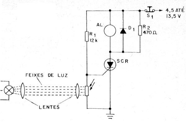 Este circuito se obtuvo en una publicación nacional de 1973, traducida de una publicación inglesa de la época. El SCR puede el TIC106. El circuito se dispara cuando la luz que incide en el sensor, que es un LDR común, se corta. La carga depende de la tensión de alimentación.